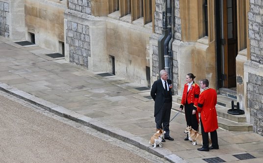 Fotoreporterzy dostrzegli królewskie corgi czekające na dziedzińcu zamku w Windsorze