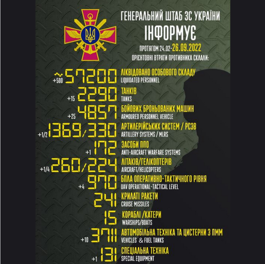Wśród strat wroga Sztab główny wymienia m.in. 2290 czołgów, 1369 systemów artyleryjskich i 15 jednostek nawodnych.