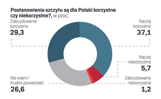 Z kolei na pytanie, czy ustalenia szczytu były dla Polski korzystne, zdecydowanie więcej respondentów odpowiedziało, że tak – 66,4 proc. Zaledwie niespełna 7 proc. sądzi, że nie. Spora grupa, bo aż 26,6 proc. badanych, nie ma w tej sprawie zdania.
