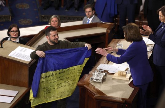 - Naród ukraiński zwycięży, bezwzględnie - mówił pod koniec swojego przemówienia prezydent Ukrainy. Na koniec podarował Kongresowi flagę Ukrainy, przekazaną dzień wcześniej przez żołnierzy z Bachmutu. W rewanżu otrzymał od Nancy Pelosi amerykańską flagę, która - jak zapewniła spiker Izby Reprezentantów - powiewała w środę nad Kapitolem.
