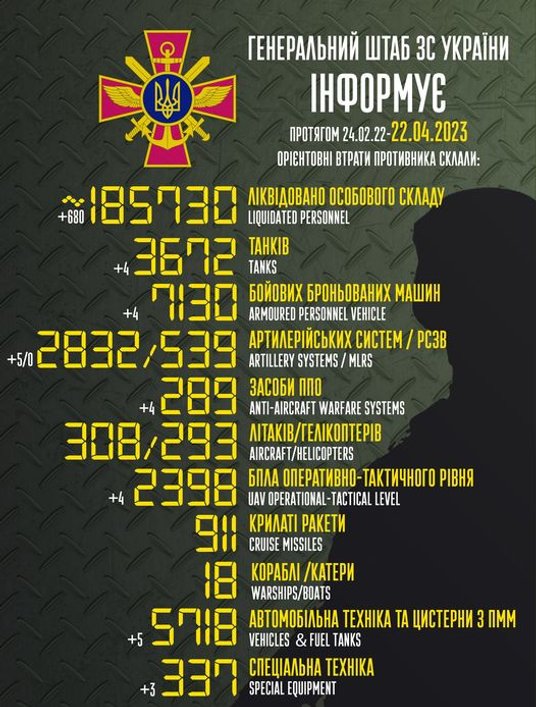 Według strony ukraińskiej od początku inwazji zginęło 185 730 rosyjskich żołnierzy.
