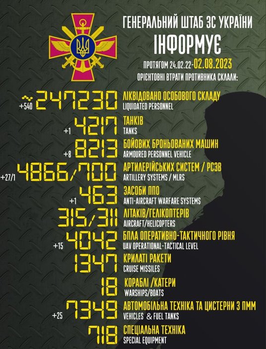 Sztab Generalny Sił Zbrojnych Ukrainy opublikował zestawienie strat strony rosyjskiej.