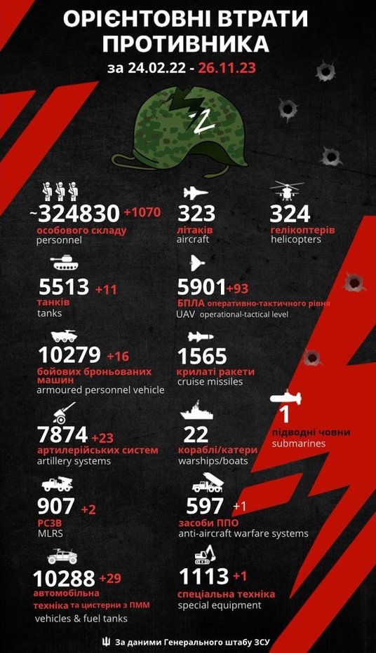 Według stanu na 26 listopada łącznie 529 osiedli na Ukrainie było pozbawionych prądu z powodu niekorzystnych warunków pogodowych, zakłóceń technologicznych i trwających działań wojennych.