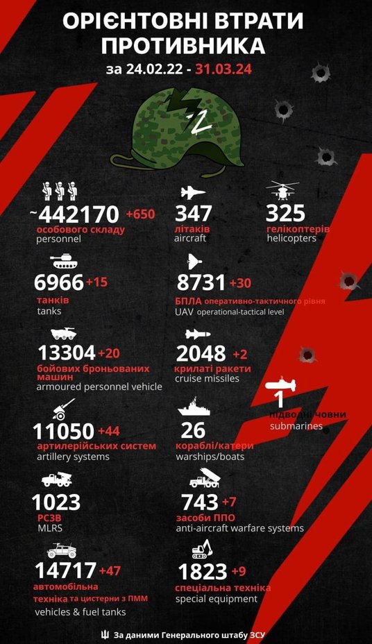 Sztab Generalny Sił Zbrojnych Ukrainy opublikował 31 marca dane o stratach wojsk rosyjskich. Według strony ukraińskiej podczas wojny zginęło już blisko pół miliona Rosjan.