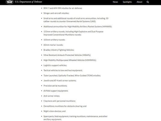 Stany Zjednoczone przekazują Ukrainie pakiet pomocy wojskowej o wartości 1 miliarda dolarów – podaje Pentagon. Pakiet obejmuje m.in. pociski artyleryjskie kal. 155 mm, w tym pociski odłamkowo-burzące i ulepszoną konwencjonalną amunicje o podwójnym przeznaczeniu; MANPADY Stinger i dodatkową amunicję do HIMARS; pociski artyleryjskie 105 mm i pociski moździerzowe 60 mm; bojowe wozy piechoty Bradley; MRAP; HMMWV.