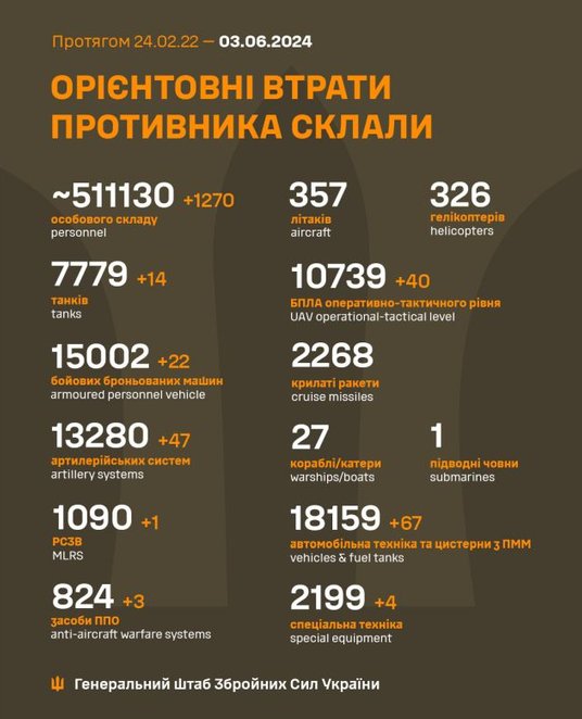 Według strony ukraińskiej ostatniej doby wyeliminowanych zostało 1270 rosyjskich żołnierzy. Rosjanie mieli też stracić 47 systemów artyleryjskich.