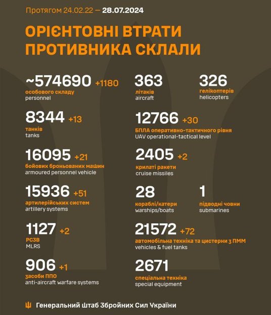 Dowódca ukraińskich sił powietrznych, generał porucznik Mykoła Ołeszczuk poinformował, że w nocy 28 lipca 2024 r. wróg zaatakował Ukrainę pociskiem kierowanym Kh-59 wystrzelonym z przestrzeni powietrznej nad Morzem Czarnym i ośmioma dronami Shahed wystrzelonymi z Przylądka Chauda na Krymie.