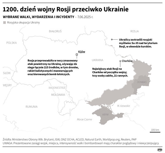 „W sobotni poranek, 7 czerwca, w wyniku udanej operacji Sił Powietrznych w kierunku kurskim, zestrzelony został rosyjski myśliwiec Su-35” - poinformowały Siły Powietrzne Ukrainy. Nie podano innych szczegółów dotyczących zestrzelonego samolotu.