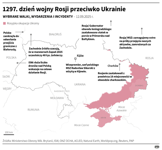12 września 2025 r. ukraińskie wojsko odnotowało 183 starcia z rosyjskimi siłami, przy czym najcięższe walki toczyły się na kierunku pokrowskim, gdzie odparto 49 ataków. Rosjanie przeprowadzili 3 ataki rakietowe, 81 nalotów i 5206 ostrzałów (w tym 59 z wyrzutni rakietowych), używając 6 rakiet i ponad 6 tysięcy dronów-kamikadze; celem były m.in. okolice Czernihowa, Zaporoża i Chersonia – wynika z komunikatu Sztabu Generalnego Ukrainy.