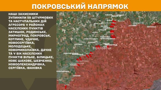 Minionej doby na froncie wojny w Ukrainie doszło do 205 starć bojowych pomiędzy siłami ukraińskimi a wojskami rosyjskimi, co – jak podkreśla Sztab Generalny Sił Zbrojnych Ukrainy – potwierdza utrzymującą się bardzo wysoką intensywność walk. Największą aktywność Rosjanie wykazali na kierunku pokrowskim, gdzie ukraińscy obrońcy odparli 59 szturmów, a ciężkie walki toczyły się także m.in. na kierunkach hulajpolskim, konstantynowskim i łymańskim.
