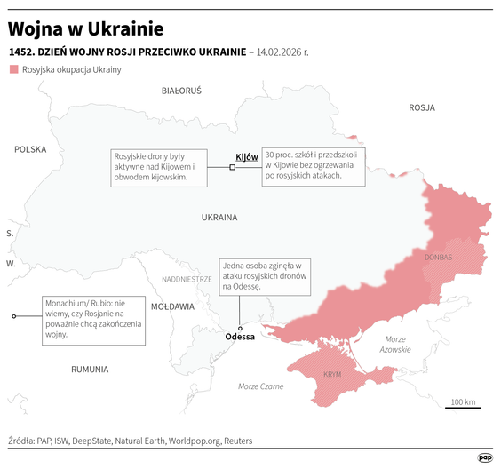 „Każdego dnia nasze miasta i społeczności dochodzą do siebie po rosyjskich atakach” – oświadczył prezydent Ukrainy, dodając, że w tym tygodniu Rosjanie atakowali Ukrainę za pomocą ok. 1300 dronów uderzeniowych, ponad 1200 kierowanych bomb lotniczych oraz 50 pocisków rakietowych, w większości balistycznych. Wołodymyr Zełenski zaznaczył, że głównym celem ostatnich ataków były obiekty systemu energetycznego. Przekazał, że w Monachium uzgodnił z przywódcami państw wspierających Ukrainę kolejne pakiety pomocy energetycznej i wojskowej do 24 lutego.