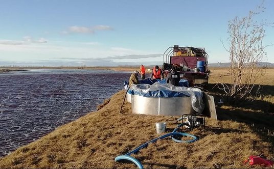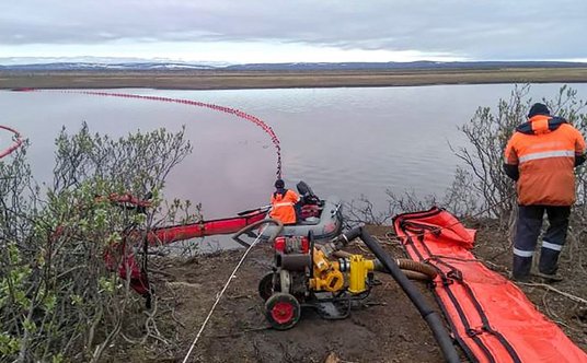 Ratownicy rozpaczliwie próbują powstrzymać plamę oleju długości ponad kilometra przed wpłynięciem do leżącego 30 kilometrów na północ od Norylska jeziora Piasiono, a stamtąd do Morza Karskiego. W sumie ze zbiornika wylała się zawartość mniej więcej 350 kolejowych cystern z paliwem.