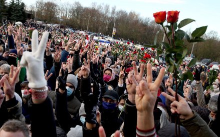 Tysiące ludzi w milczeniu podniosło ręce w powietrzu, trzymając w dłoniach kwiaty, na pogrzebie 31-letniego białoruskiego demonstranta Romana Bondarenki.