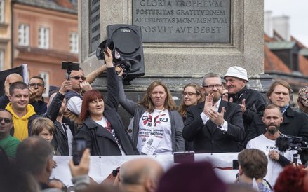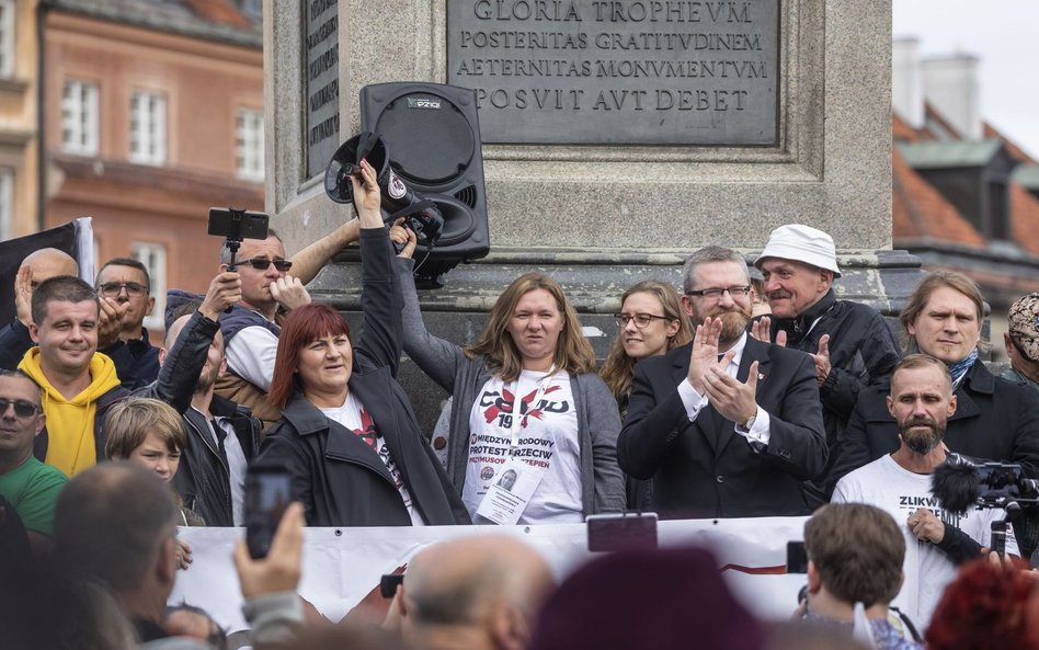 Antycovidowcy zebrali się na Placu Zamkowym. Większość z nich nie miała maseczek ani nie przestrzegała zasady dystansu społecznego.