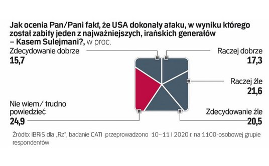 Badani przez IBRiS na zlecenie „Rzeczpospolitej", nie są entuzjastami akcji prezydenta USA, w wyniku której zabity został irański generał Kasem Sulejmani. 33 proc. ocenia ją pozytywnie, w tym 17,5 – „zdecydowanie dobrze". Przeciwne zdanie o ostatniej amerykańskiej interwencji na Bliskim Wschodzie ma 42,1 proc. badanych (w tym 20,4 ocenia atak zdecydowanie źle). Aż jedna czwarta respondentów nie ma zdania w tej sprawie (24,9 proc.).
