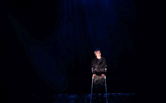 Co prawda Konrad porusza się ciężko o kulach, jak Janina Ochojska niosąca pomoc w Polsce i za granicą, ale uskrzydlony dobrem – potrafi cieszyć się i pięknie tańczyć. Przybity tym, co się dzieje w kraju, w pierwszym monologu, transmitowanym z piwnicy teatru na ekran grzmi, że „Ciemności kryją ziemię i lud we śnie leży”. (Panie, cała Polska młoda/ Wydana w ręce Heroda)”.
