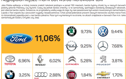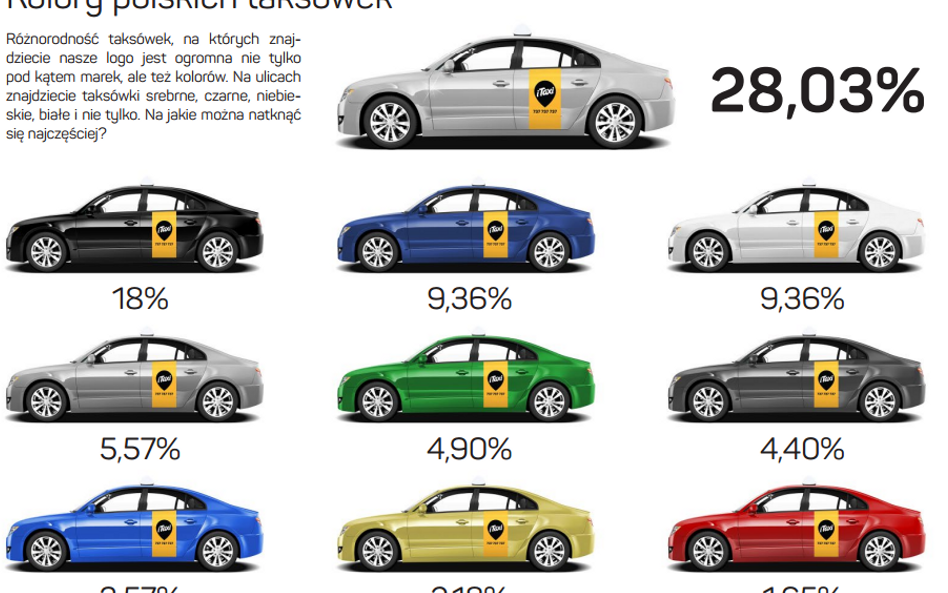 Aż 28 proc. taksówek ma lakier w kolorze srebrnym. Z 18 proc., na drugim miejscu popularności znalazł się czarny. Inne barwy nie przekroczyły 10 proc.