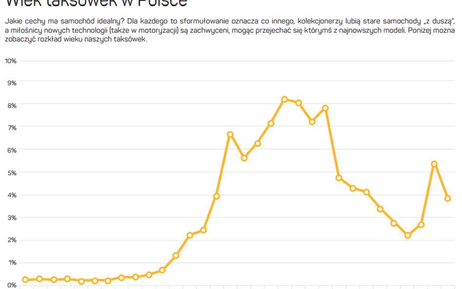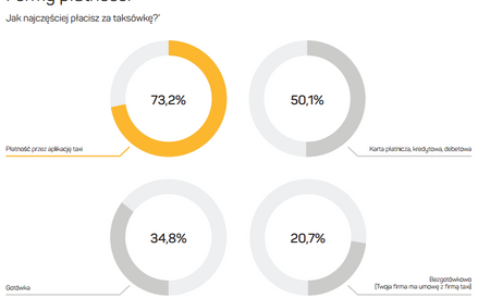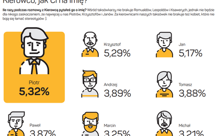 Znalazły się tam inne popularne imiona kierowców, kolory i marki taksówek, wykres z wiekiem pojazdów, podział pasażerów wg grup wiekowych oraz ich średnie zarobki. Można dowiedzieć się także, co poza ceną ma znaczenie dla klientów, w jaki sposób zamawiają taksówkę i jak za nią płacą.