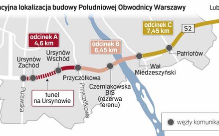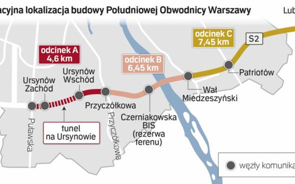 Cała inwestycja – budowa obwodnicy w ciągu drogi ekspresowej S2 pomiędzy węzłami Puławska i Lubelska – została podzielona na trzy odcinki. Pierwszy o długości ok. 4,6 km przebiega od węzła Puławska do węzła Przyczółkowa z budową tunelu pod Ursynowem. Ma go budować włoskie Astaldi. Drugi o długości ok. 6,45 km to fragment trasy do węzła Wał Miedzeszyński wraz z mostem przez Wisłę. Przetarg wygrało konsorcjum z tureckim Gulermakiem. Ostatni kawałek o długości ok. 7,45 km do węzła Lubelska z budową estakad nad Mazowieckim Parkiem Krajobrazowym przypadł firmie Warbud.