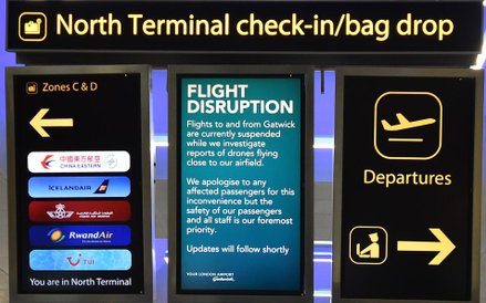 Drony w okolicach Gatwick pojawiły się w środę 19 grudnia i całkowicie sparaliżowały działanie portu lotniczego na 36 godzin. Wiele lotów zostało przekierowanych do innych lotnisk, jak Londyn-Heathrow, City i Luton. Policja intensywnie poszukuje osoby lub osób, które są właścicielami dronów, które pojawiły się w pobliżu lotniska za każdym razem, gdy podejmowana była próba ponownego otwarcia pasa startowego.