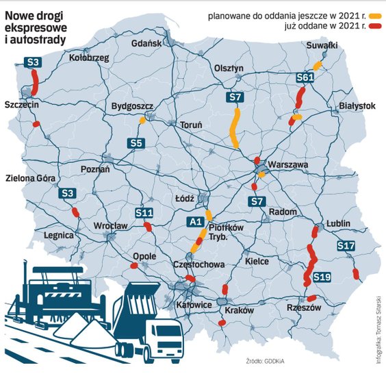 Które fragmenty budowanych szybkich dróg zostaną włączone do ruchu w przyszłym roku – tego oficjalnie nie podano. Na pewno znajdą się wśród nich m.in.: odcinek S61 Guty – Ełk Południe czy kilka odcinków trasy S19: Niedrzwica Duża – Kraśnik, Zdziary – Rudnik oraz Kamień – Sokołów Małopolski. Także ostatni już budowany odcinek autostrady A1 pomiędzy Piotrkowej Trybunalskim a Kamieńskiem, którego otwarcie przewidziano na drugą połowę roku.