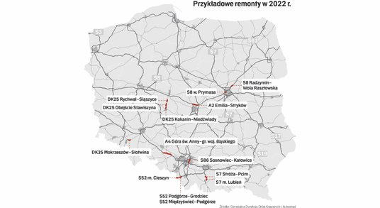 Będzie więcej pieniędzy na remonty dróg. W 2022 r. Generalna Dyrekcja Dróg Krajowych i Autostrad (GDDKiA) zwiększa nakłady na ten cel do około 400 mln zł. Już teraz rozdysponowano 238 mln zł – pozwolą sfinansować 48 przedsięwzięć, z których 46 obejmujących łącznie 169 kilometrów dróg (w rozbiciu na dwie jezdnie) zostanie zrealizowanych jeszcze w tym roku.