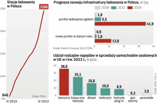 Pod koniec kwietnia 2022 r. w Polsce funkcjonowało 2166 ogólnodostępnych stacji ładowania pojazdów elektrycznych z 4217 punktami – poinformowało w poniedziałek Polskie Stowarzyszenie Paliw Alternatywnych (PSPA). Tymczasem liczba samochodów osobowych z elektrycznym napędem wzrosła w ub. miesiącu o 87 proc. r./r., sięgając 44,7 tys. Z wyliczeń Fundacji Promocji Pojazdów Elektrycznych (FPPE) wynika, że w ciągu ostatnich dwóch lat liczba e-aut przypadających na jeden punkt ładowania wzrosła dwukrotnie, a przedstawiciele branży motoryzacyjnej nie ukrywają obaw przed dalszym rozchodzeniem się słabego tempa rozwoju infrastruktury i szybko rosnącego popytu na e-auta. – Tempo rozbudowy sieci stacji wymaga przyspieszenia – zaapelował Polski Związek Przemysłu Motoryzacyjnego (PZPM).