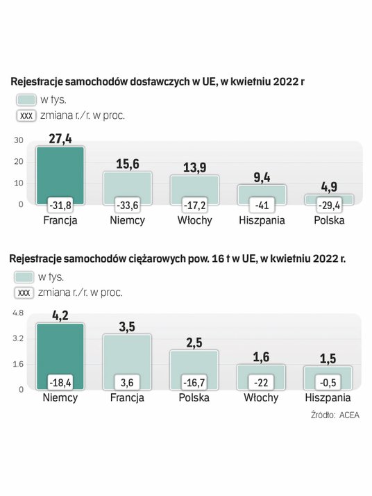 Najpierw pandemia, teraz wojna w Ukrainie: branża transportowa w całej Europie nie może wyjść z kolejnych problemów podkopujących jej kondycję finansową. A ta wciąż słabnie, co widać po głębokim spadku inwestycji w odbudowę i unowocześnienie flot. Jak podało w środę europejskie stowarzyszenie producentów pojazdów ACEA, sprzedaż nowych samochodów użytkowych w krajach UE spadła w kwietniu o ponad 27 proc., do niewiele ponad 125 tys. Także dane skumulowane liczone od stycznia pokazały głęboki, przeszło 20-procentowy spadek, przy czym na zdecydowanej większości rynków okazał się on dwucyfrowy.