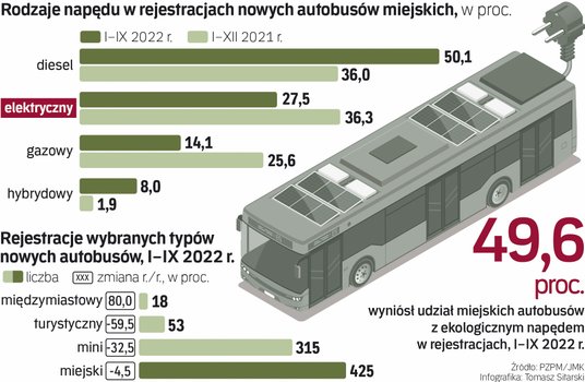Miejskie spółki przewozowe zwiększyły za to zakupy diesli. Od stycznia ich udział w rejestracjach przekroczył połowę (50,1 proc.), podczas gdy w końcu 2021 r. wynosił 36 proc., ustępując elektrobusom z udziałem 36,3 proc. Teraz jednak autobusy elektryczne stanowią już tylko 27,5 proc. kupowanego nowego taboru.