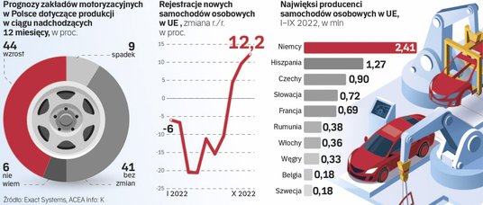 Gdy w 9 na 11 badanych krajów ponad połowa przedstawicieli fabryk motoryzacyjnych zakłada wzrost produkcji, to prognozy polskich producentów pełne są obaw. Jeśli np. w Turcji lepszych wyników spodziewa się 83 proc. badanych firm, w Holandii 77 proc., a w Czechach 70 proc., to w Polsce zaledwie 44 proc. To nawet o 9 pkt proc. mniej niż przed rokiem. Prawie jedna dziesiąta przedsiębiorstw sektora zakłada, że wielkość produkcji wręcz się skurczy.