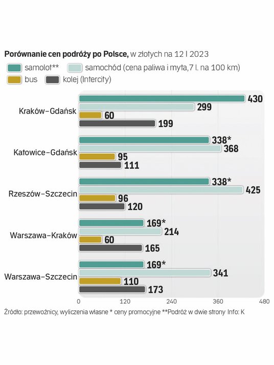 W Polsce podróż koleją opłaca się jedynie wówczas, gdy taki sam dystans chcemy pokonać w pojedynkę samochodem, bądź gdy kupujemy bilet na samolot tuż przed odlotem. Ale i w Ryanairze, i w Locie jest mnóstwo promocji. Podczas ostatniej „szalonej środy”, czyli cotygodniowej wyprzedaży biletów za przelot na trasie np. z Warszawy do Krakowa zapłacimy 169 złotych (bilet powrotny z bagażem podręcznym, za walizkę trzeba dopłacić). W Ryanairze zdarzają się bilety po 67 złotych w jedną stronę. Na tej samej trasie i w tym samym terminie InterCity oferuje bilet (II klasa) za 165 złotych. z powrotnym to wydatek 330 złotych.