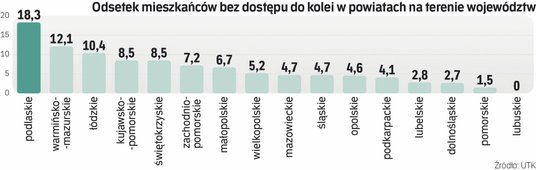 Na drugim biegunie znajduje się woj. podlaskie, gdzie dostępu do kolejowych stacji pasażerskich nie mają mieszkańcy pięciu powiatów, tj. 214 tys. osób (18 proc. zaludnienia). Bardzo słabe wykorzystanie kolei widoczne jest także na Podkarpaciu. Poza Przemyślem i Rzeszowem wykorzystanie kolei jest znikome, w powiecie brzozowskim nie istnieje infrastruktura kolejowa, a w bieszczadzkim jedna linia wykorzystywana była głównie do ewakuacji uchodźców po wybuchu wojny w Ukrainie. Przy tym w większości podkarpackich powiatów wskaźnik wykorzystania kolei to jeden wsiadający lub wysiadający z pociągu na jednego mieszkańca.