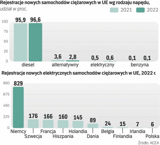 Na razie unijny rynek nowych samochodów ciężarowych jest zdominowany przez diesle. Co prawda, według Europejskiego Stowarzyszenia Producentów Pojazdów ACEA w 2022 r. sprzedaż elektrycznych ciężarówek znacznie wzrosła – o jedną trzecią r./r., ale ilościowo wynik nie był imponujący: w całej UE zarejestrowano 1656 sztuk, z tego połowę w Niemczech. – W ubiegłym roku pojazdy elektryczne stanowiły zaledwie 0,6 proc. unijnego rynku samochodów ciężarowych – podała ACEA.