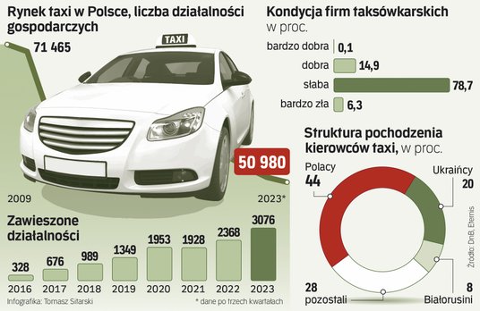 Tradycyjny kierowca taksówki to zawód, który przechodzi do historii. Po trzech kwartałach 2023 r. nad Wisłą zarejestrowanych było niecałe 51 tys. działalności tego typu, a to oznacza, że od momentu wybuchu pandemii zniknęło blisko 5 tys. firm. Z racji specyfiki branży chodzi głównie o jednoosobowe działalności gospodarcze, choć i korporacje taxi konsekwentnie zamykają działalność. Jak wynika z najnowszych danych wywiadowni gospodarczej Dun & Bradstreet (DnB), które „Rzeczpospolita” publikuje jako pierwsza, w sumie od stycznia do końca września br. ubyło przeszło 700 tego typu podmiotów, a co więcej, na liście zawieszonych działalności pojawiło aż 3076 firm, czyli o 30 proc. więcej niż w 2022 r.
