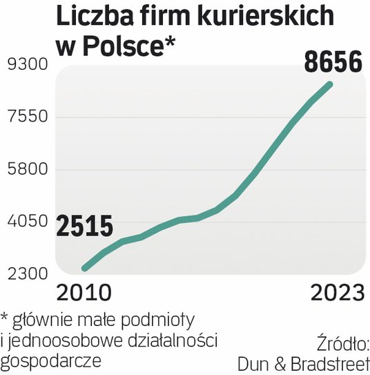 W ciągu ostatnich pięciu lat liczba firm kurierskich w naszym kraju, głównie tych małych podmiotów oraz jednoosobowych działalności gospodarczych, skoczyła o ponad 52 proc. W ub.r. dynamika ta sięgnęła ok. 8 proc. – wynika z najnowszych analiz wywiadowni gospodarczej Dun & Bradstreet (DnB).