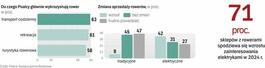Przedstawiciele sektora zgodnie zauważają coraz mocniejsze przesuwanie się zainteresowania kupujących w stronę modeli elektrycznych, co widzą także producenci, jak i branżowe Polskie Stowarzyszenie Rowerowe. Ponad 71 proc. przedstawicieli salonów rowerowych prognozuje rozwój segmentu e-rowerów w 2024 r. – wynika z najnowszego badania organizacji. W minionym sezonie wzrosty ich sprzedaży odnotowało 42 proc. badanych sklepów, a co trzeci salon przyznał, że udało się utrzymać zbliżone wyniki. Obecnie ok. 10 proc. sprzedawanych rowerów to modele elektryczne.