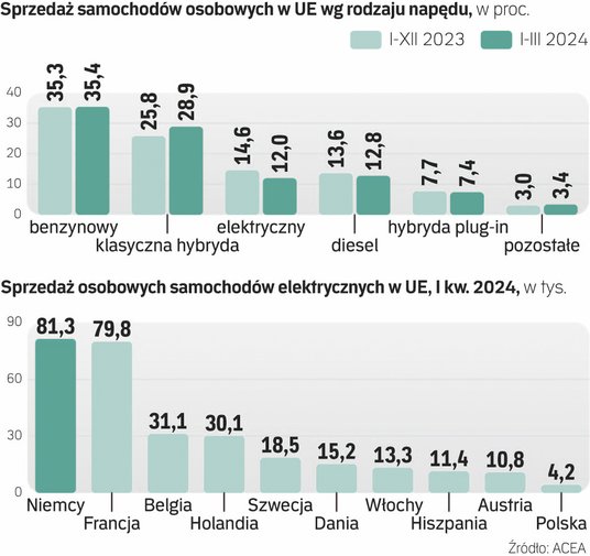 Początkowy entuzjazm wobec samochodów elektrycznych wyraźnie słabnie, a spadki popytu przyprawiają producentów o ból głowy przez niepewność co do rozwoju rynkowego trendu. Elektryki są za drogie, infrastruktura ładowania za słabo rozwinięta, a konsumenci nie dość przekonani do przesiadki na prąd, po której musieliby się mierzyć się z niedostatkami nowej technologii. Już w grudniu 2023 r. sprzedaż nowych samochodów elektrycznych spadła w krajach Unii Europejskiej po raz pierwszy od kwietnia 2020 roku. Z kolei w marcu 2024 r. zmalała r./r. o 11,3 proc., do 134,4 tys., a ich w unijnym rynku stopniał z 13,9 proc. w marcu 2023 r. do 13 proc. w ubiegłym miesiącu. Jak wynika z danych Europejskiego Stowarzyszenia Producentów Pojazdów ACEA, elektrykom nie udało się poprawić także wyniku kwartalnego: pod względem rynkowego udziału, pierwsze trzy miesiące 2024 r. okazały się słabsze niż rok wcześniej, a choć sama sprzedaż była o 3,8 proc. wyższa (zarejestrowano niecałe 333 tys. w pełni zelektryfikowanych samochodów wobec prawie 321 tys. rok wcześniej), to cały rynek – wliczając wszystkie rodzaje napędów – rósł szybciej: o 4,4 proc., podczas gdy wcześniej było odwrotnie.