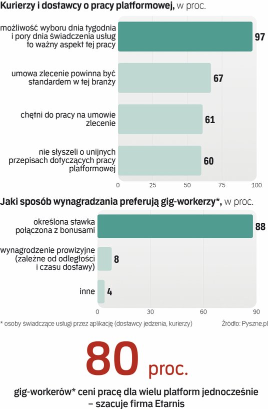 Resort pracy odbywa już pierwsze konsultacje z branżą w kontekście przyszłej ustawy o pracy platformowej – wynika z nieoficjalnych informacji „Rzeczpospolitej”. Transpozycja regulacji nie będzie jednak łatwa. Dotarliśmy do najnowszych badań przeprowadzonych wśród blisko tysiąca kurierów dostarczających m.in. posiłki dla aplikacji Pyszne.pl, z których wynika, że nie chcą oni proponowanego przez UE etatu. Jednocześnie niemal dwie trzecie ankietowanych wskazuje, że preferowanym przez nich rozwiązaniem są umowy-zlecenia. Tym samym nie popierają dość popularnych w branży rozwiązań. – Powszechne są umowy na wynajem pojazdu, np. roweru, z których do dostawców trafia do 85 proc. wynagrodzenia, a zaledwie 15 proc. to zlecenie. To takie balansowanie w granicach prawa. Ponieważ w niektórych firmach nawet 60 proc. kurierów to obcokrajowcy, przybywa również tzw. spółek cudzoziemskich. To kolejny sposób, by z wykonującymi usługi dostaw nie zawierać normalnych umów – mówi nam osoba z branży, w której działają tacy gracze jak Pyszne, Bolt, Uber, Wolt czy Glovo.
