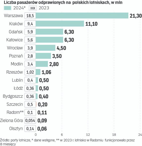 Lotniska wyraźnie przyspieszyły inwestycje w rozbudowę infrastruktury. Najwięcej na poprawę jakości obsługi pasażerów i przewoźników wyda warszawskie Lotnisko Chopina – program inwestycyjny do roku 2029 ma wartość 1,6 mld zł. Ale ponad miliard złotych wydadzą także m.in. lotnisko w krakowskich Balicach i Katowice-Pyrzowice. Zaniedbany podwarszawski Modlin wyliczył swoje potrzeby inwestycyjne na 550 mln zł.