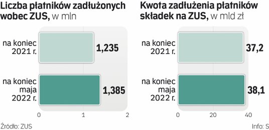 Z informacji, które „Rzeczpospolita” uzyskała w ZUS, wynika, że na koniec maja 2022 r. zaległości w opłacaniu składek na ubezpieczenia społeczne miało 1 mln 385 tys. płatników (mniej niż połowa nadal aktywnie prowadzi działalność). Od początku roku przybyło ich niemal 150 tys. Wzrostowi liczby dłużników towarzyszy wzrost łącznego zadłużenia płatników wobec ZUS. Na koniec maja tego roku było to już niemal 38,1 mld zł. W samych tylko pięciu pierwszych miesiącach tego roku nowe zadłużenie sięgnęło niemal 3,9 mld zł.