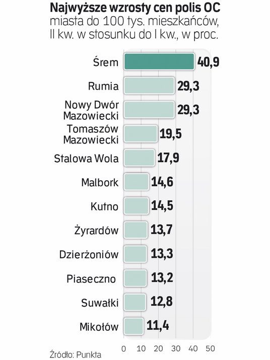 Najdroższym polskim miastem w poprzednim kwartale była… Rumia, z przeciętną stawką na poziomie 735 zł. Tamtejsi kierowcy płacili aż o 37 proc. więcej od ogólnopolskiej średniej. W pierwszej dziesiątce najdroższych miast w Polsce znalazły się: Piaseczno, Nowy Dwór Mazowiecki i Śrem – w tym wielkopolskim mieście średnia cena polisy OC w ciągu kwartału wzrosła o… 40,7 proc. (z 452 zł do 636 zł). Ceny powyżej średniej ogólnopolskiej płacili kierowcy w takich miejscowościach, jak Tomaszów Mazowiecki, Żyrardów czy Dzierżoniów.