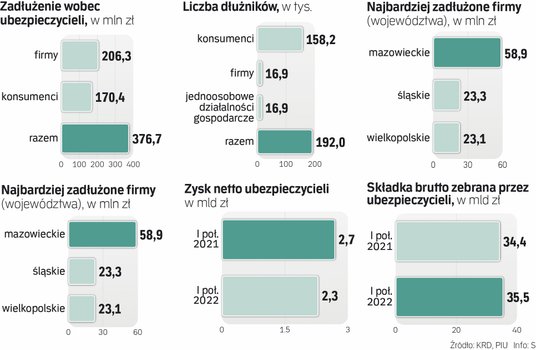 Wśród konsumentów rekordzistą jest mieszkaniec powiatu legionowskiego na Mazowszu, który ma do oddania 623 tys. zł. Wśród firm prym wiedzie przedsiębiorstwo z branży budowlanej z powiatu radomskiego, także w województwie mazowieckim. W przypadku tej firmy uzbierało się 10,8 mln zł zaległości za polisy.