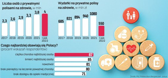 Polska Izba Ubezpieczeń podliczyła właśnie, że w pierwszych sześciu miesiącach 2022 r. składka przypisana brutto w ubezpieczeniach zdrowotnych sięgnęła 548,8 mln zł. W całym zeszłym roku było to 1,080 mld zł. Liczba posiadaczy polis zdrowotnych wzrosła w tym roku, w porównaniu z tym samym okresem zeszłego roku, o 11,6 proc., do 3,951 mln.