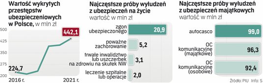 Z danych zebranych przez Polską Izbę Ubezpieczeń wynika, że ponad 4,5 tys. przypadków wykrytych w zeszłym roku prób wyłudzeń dotyczyło ubezpieczeń na życie. Ich łączna wartość sięgnęła 34 mln zł. Najwięcej oszustw dotyczyło zawyżania kosztów leczenia i operacji. Co roku wykrywanych jest też kilkaset fałszywych zawiadomień o śmierci ubezpieczonego.