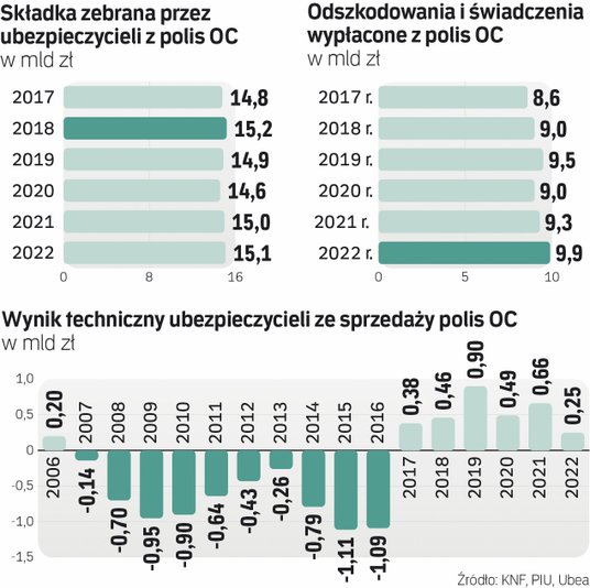 Według danych Polskiej Izbie Ubezpieczeń łączna składka ze sprzedaży polis OC zebrana w zeszłym roku przez ubezpieczycieli sięgnęła 15,05 mld zł. To o 0,8 proc. więcej niż w 2021 r., kiedy ubezpieczyciele zebrali z OC 14,93 mld zł. Średnia szkoda miała wartość 9199 zł i była wyższa niż rok wcześniej o 8,4 proc. Wtedy naprawa uszkodzonego auta w ramach OC kosztowała średnio 8484 zł. Wszystko to prowadziło do pogorszenia się rentowności tego segmentu rynku ubezpieczeniowego.
