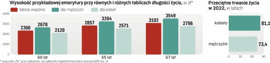 Gdyby do obliczania świadczenia uwzględniane były wartości długości przeżycia dla każdej z płci osobno i w tym samym wieku, na emeryturę przechodziliby mężczyzna i kobieta, to okazałoby się, że panie otrzymają świadczenie niższe niż panowie. Mają bowiem przed sobą większą statystycznie liczbę lat, przez które będą żyły – w porównaniu z panami. Ich kapitał emerytalny dzielony byłby przez większą wartość niż w przypadku mężczyzn.