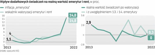 Gdyby nie dodatkowe świadczenia w postaci 13. i 14. emerytury, wartość pieniędzy, którymi emeryci i renciści dysponują, nie wzrastałaby realnie w ostatnich trzech latach. Nie zapewniłaby tego sama marcowa waloryzacja, pomimo iż jest ustalana na podstawie inflacji emeryckiej z poprzedniego roku.