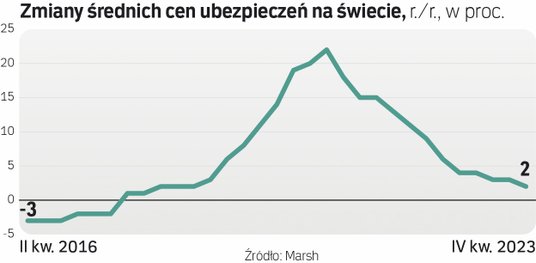 W IV kwartale 2023 r. ceny ubezpieczeń na świecie wzrosły średnio już tylko o 2 proc. w ujęciu rocznym. Takie informacje przynosi najnowszy raport Marsh Global Insurance Market Index. Jego autorzy mówią o stabilizacji cen ubezpieczeń, bowiem w wielu regionach świata kształtowały się one na podobnym poziomie jak trzy miesiące wcześniej. Tak było w Wielkiej Brytanii, Kanadzie, Azji i w regionie Pacyfiku. W USA nastąpił wzrost cen ubezpieczeń o 3 proc., w Europie o 4 proc., w Indiach, na Bliskim Wschodzie i w Afryce także o 4 proc., a w Ameryce Łacińskiej i na Karaibach o 8 proc.
