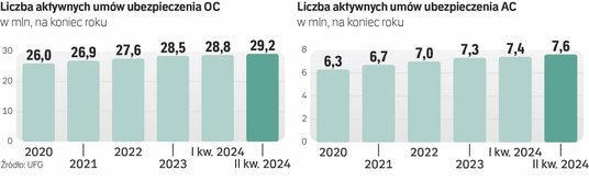 Jak pokazują dane Ośrodka Informacji UFG, liczba aktywnych umów obowiązkowego ubezpieczenia OC komunikacyjnego wyniosła na koniec czerwca 29,15 mln, a liczba aktywnych umów dobrowolnego ubezpieczenia AC (autocasco) – 7,56 mln.