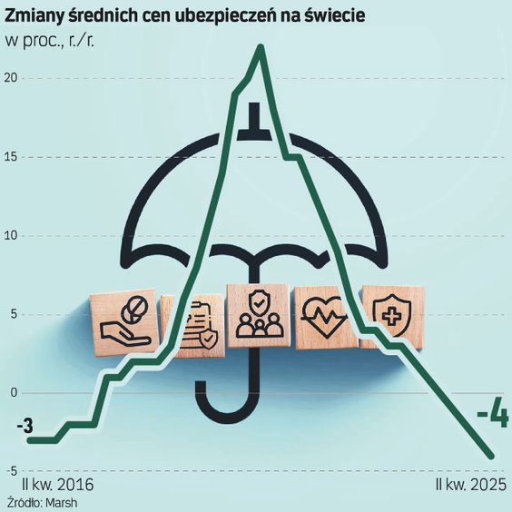 Trend wzrostowy cen polis ubezpieczeniowych na świecie utrzymywał się od końca 2017 r. Początkowo wzrosty były niewielkie, ale potem gwałtownie przyspieszyły. Szczyt przypadł na ostatni kwartał 2020 r., gdy ubezpieczenia na świecie zdrożały średnio o 22 proc. w porównaniu z czwartym kwartałem 2019 r. Począwszy od pierwszego kwartału 2021 r. wzrosty zaczęły jednak hamować. W pierwszym kwartale 2024 r. polisy zdrożały średnio już tylko o 1 proc. w ujęciu rocznym, a w drugim nie zmieniły się. Trzeci kwartał przyniósł długo wyczekiwany spadek, o 1 proc., który w końcówce roku pogłębił się do 2 proc., a w pierwszym kwartale 2025 r. do 3 proc.